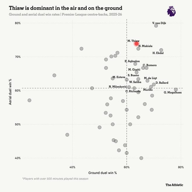 他73.9%的空中对抗成功率在所有中后卫中排名第二,尽管对手球队常常在定位球中寻找他这个点,而非身高2米的伯恩。他的空中优势明显改善了舍尔最突出的弱点。
